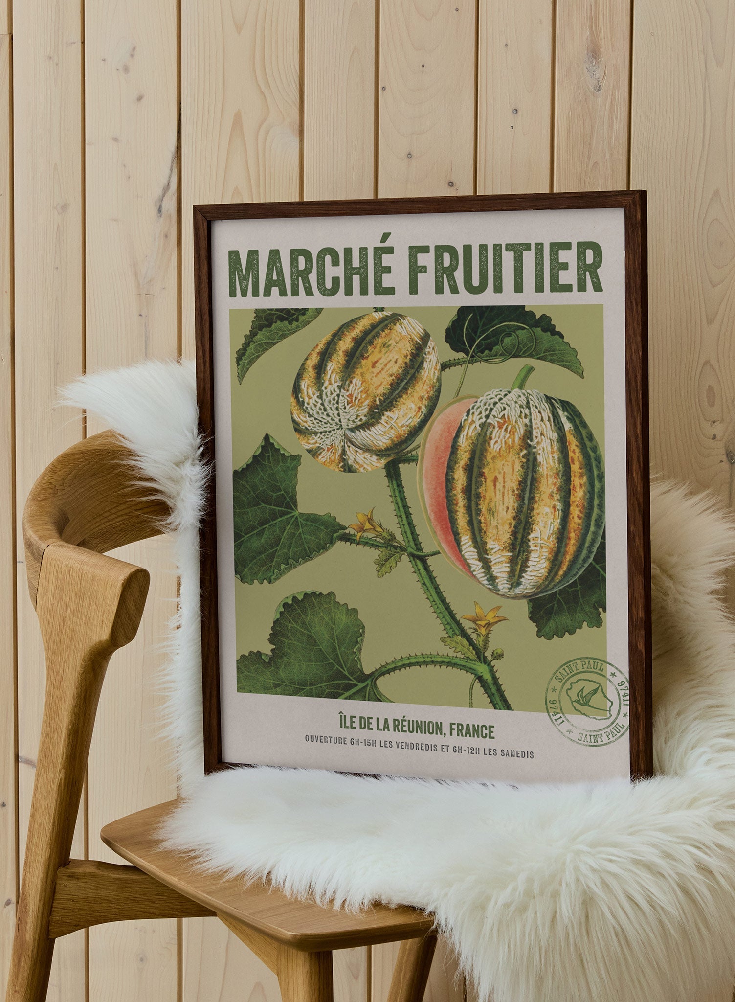Lush melons and sprawling green vines create a striking composition in this vintage-style market print. The deep greens and rich golden tones capture the warmth of sun-ripened fruit, while the textured botanical details lend a classic, archival quality. Bold typography and a subtle postmark detail transport you straight to a bustling fruit market on the Île de la Réunion.